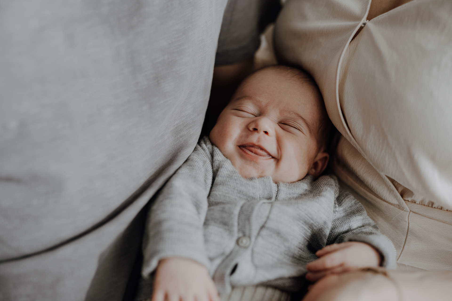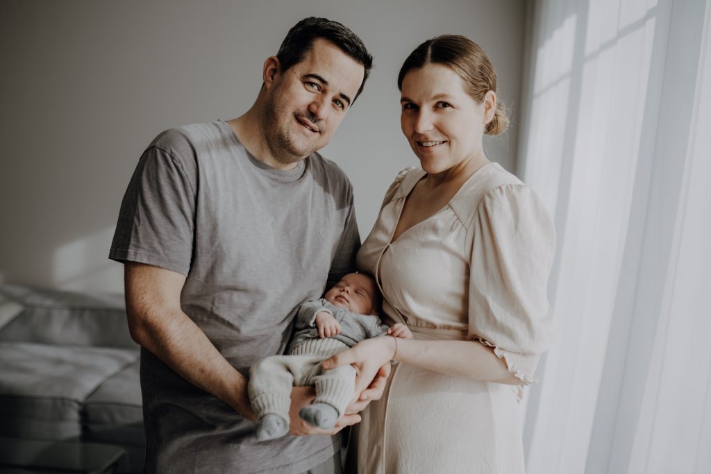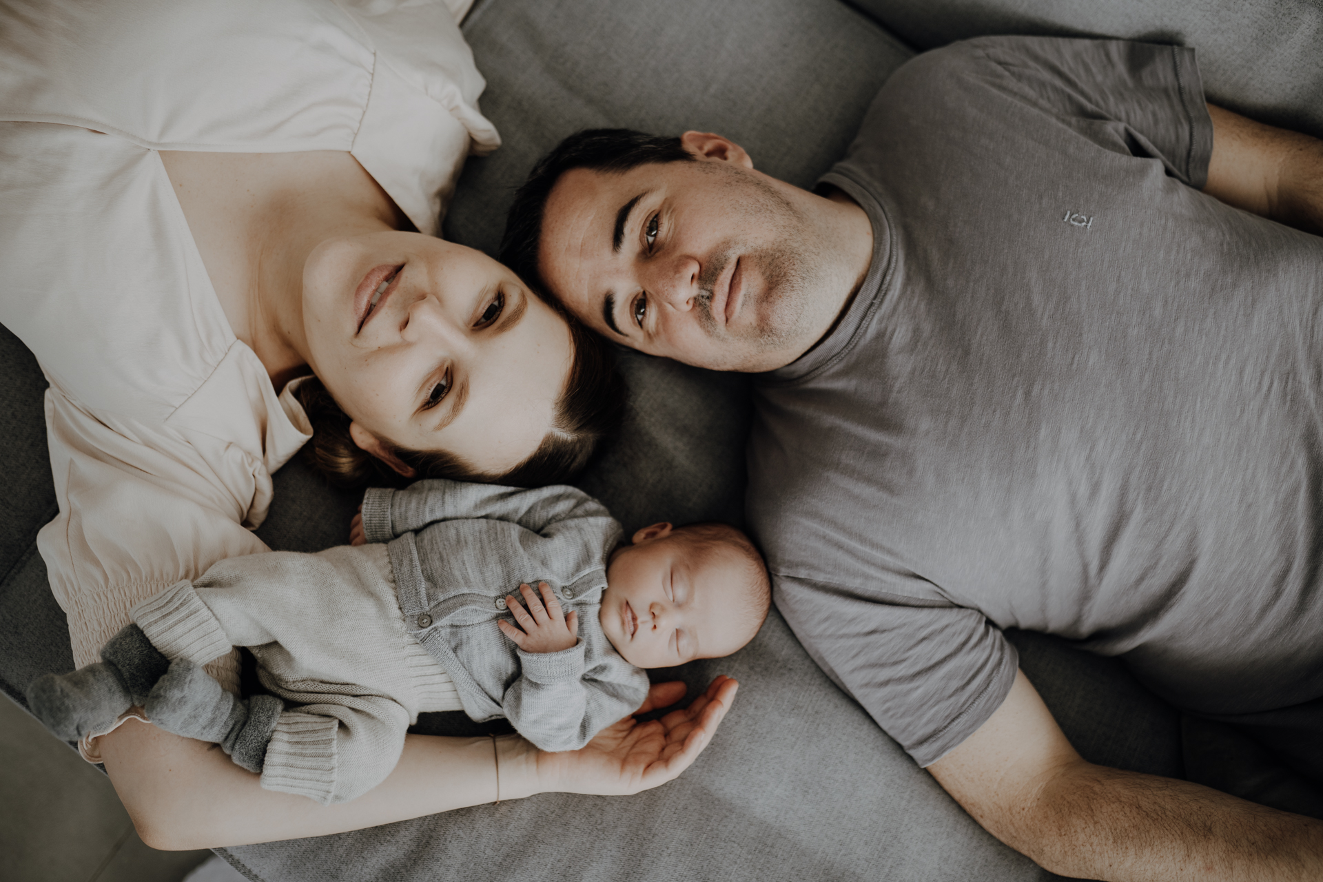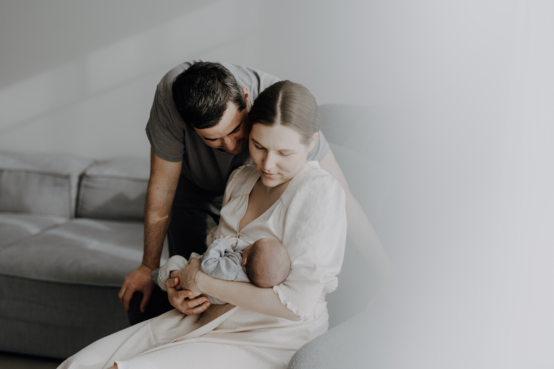 Das Newborn Homeshooting fand in dem modern eingerichteten Zuhause der frischgebackenen Eltern statt. Die weißen Vorhänge fingen das sanfte Tageslicht ein und tauchten die Räume in eine ruhige, warme Atmosphäre. Die kleine Louise, noch nicht einmal eine Woche alt, schlief während des Shootings fast durchgehend und ließ uns so die zarten und ruhigen Momente eines Neugeborenen einfangen.